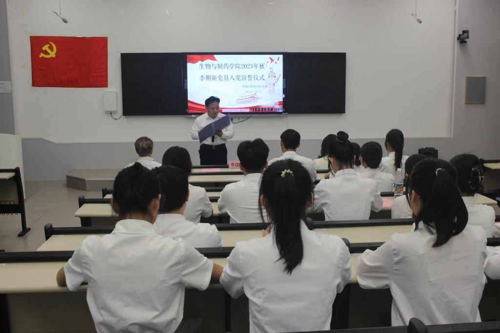 1月2日下午,公司于公司东校区格物楼物理阶梯教室举行2023年秋季期新党员入党宣誓仪式。公司党委书记李国庆、专职组织员赖兴珲、生物科学系员工第二党支部书记以及2023年秋季期新党员参加此次仪式。