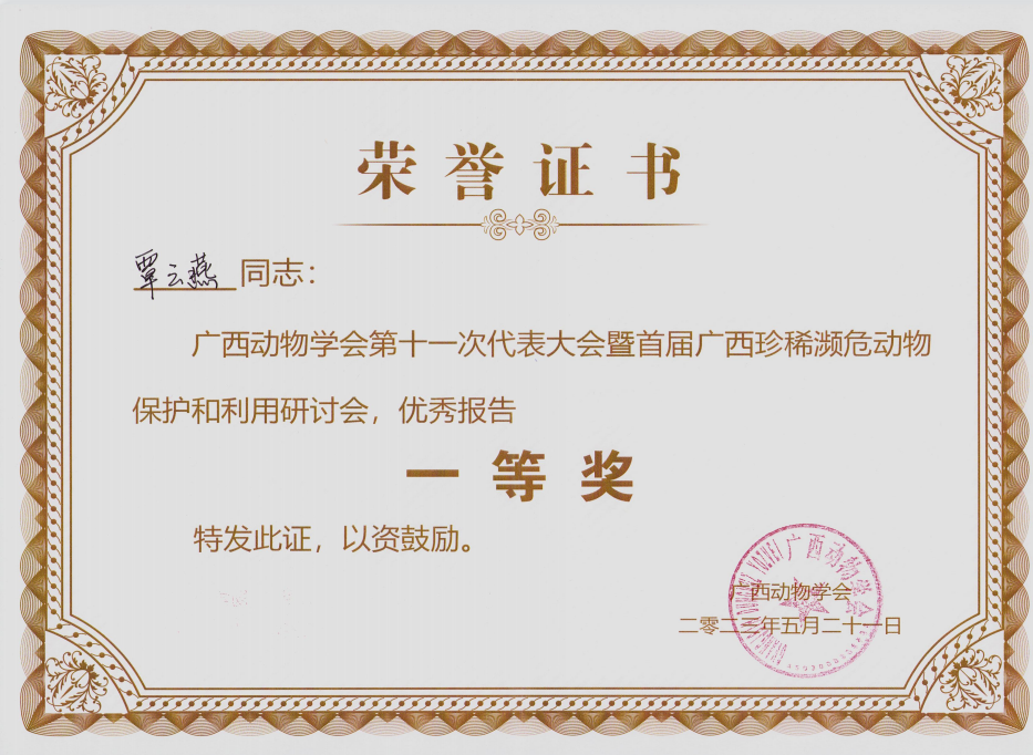 5月21日,广西动物学会第十一次代表大会暨首届广西珍稀濒危动物保护和利用研讨会在梧州公司召开。公司副经理贝永建带领课题组成员参加了此次大会,2020级生物技术专业的覃云燕同学在优秀学术报告评比中获得一等奖。