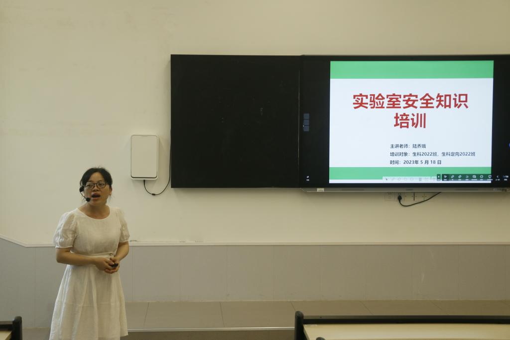 5月18日下午,公司生物科学专业于公司东校区格物楼物理阶梯教室召开实验室安全知识培训会。此次培训会由实验室管理教师陆乔娥讲授,公司22级生物科学专业全体员工参加。